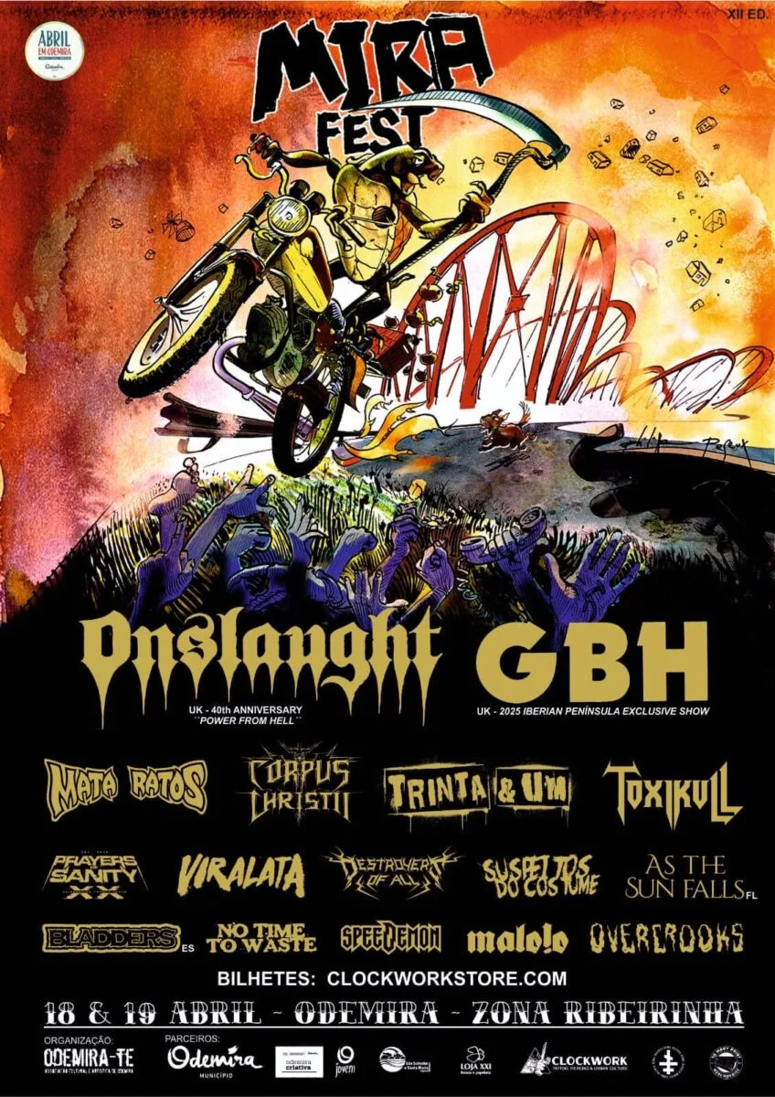 ES: Aquí tenéis el cartel definitivo de la XII edición del festival Mira Fest. Hay 16 bandas rockeando en Odemira los días 18 y 19 de abril. El río correrá lleno… el barco se moverá.