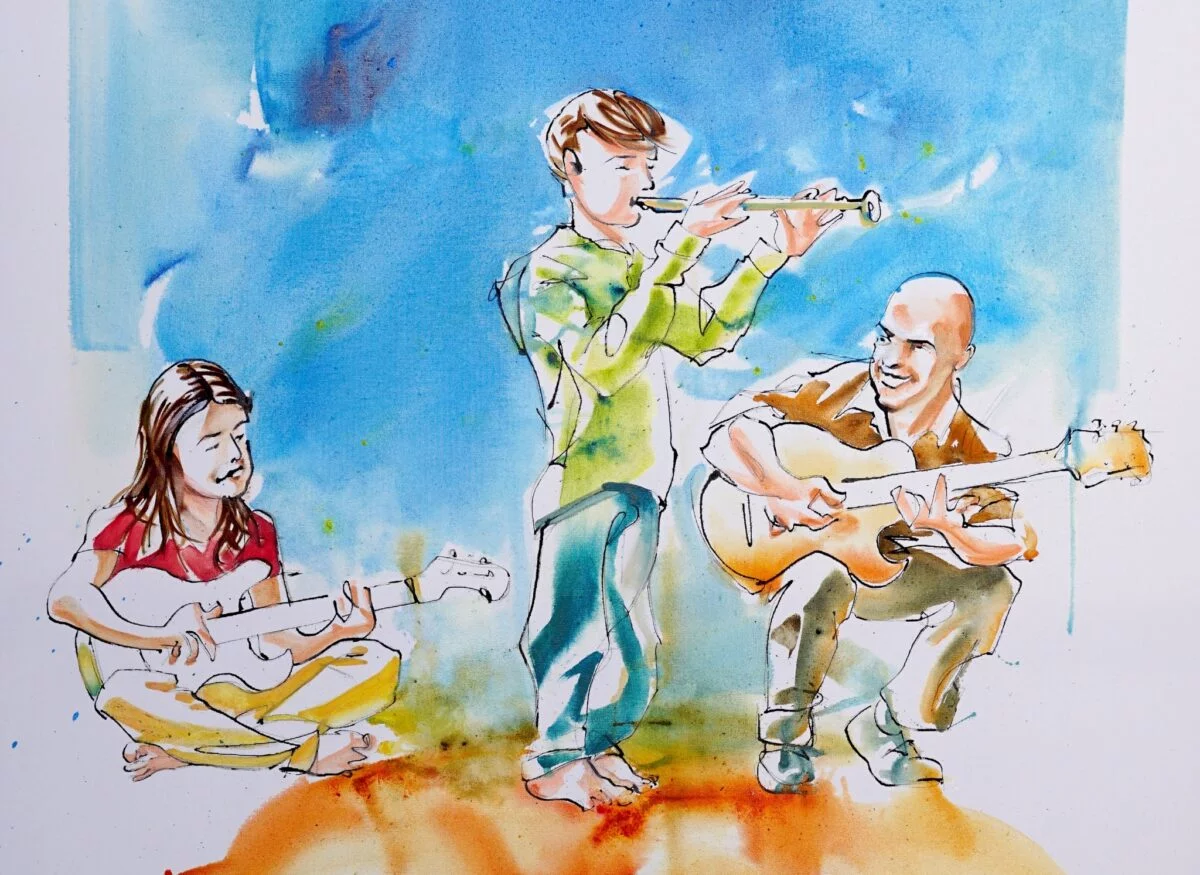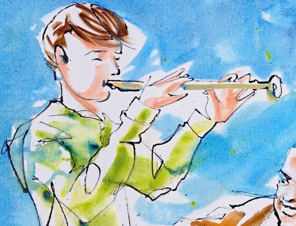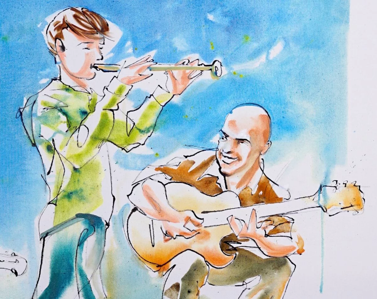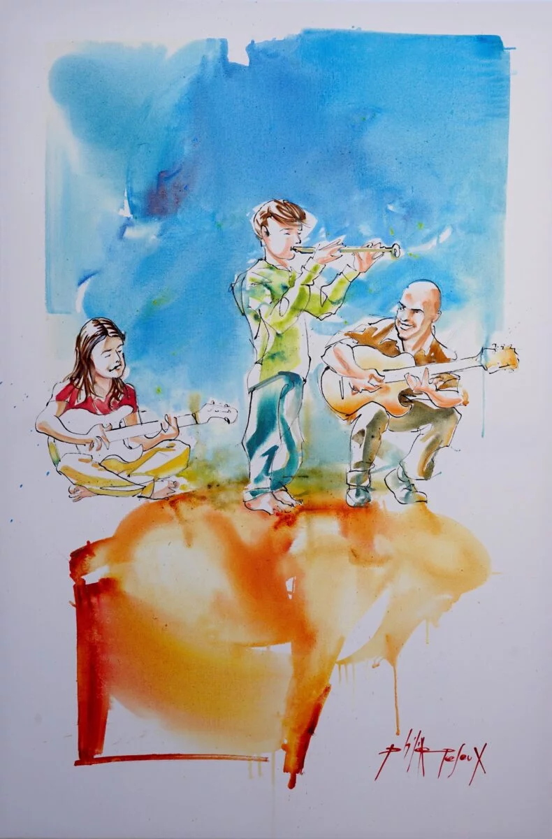 Un travail de commande inspiré de mes croquis sur le vif… mais réalisé à un format de 1 m x 1,50 m sur toile à l’encre de chine et à l’huile. Merci Carla !